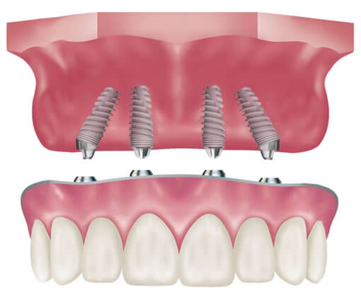 O implante dentário repõe a raiz de dentes perdidos por meio da inserção, no osso maxilar ou no mandibular, de um cilindro rosqueável que é feito de titânio, metal biologicamente compatível que se integra perfeitamente ao osso, esta junção é chamada de osseointegração.